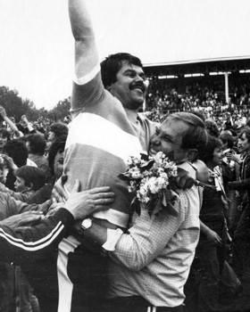 Gerd Struppert im Jubel mit Manfred Walter nach dem Klassenerhalt gegen Union 1984 (Fotos: Westend-Presseagentur)