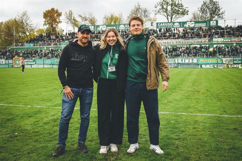Beim Heimspiel gegen Hertha BSC II stellten Leon Piotrowski von Raumdeuter (rechts im Bild), Emily Paula Ryl (Marketing & Mitgliederwesen BSG Chemie Leipzig) und Christian Kairies (links im Bild), der das Projekt ehrenamtlich von Beginn an begleitet, vor.