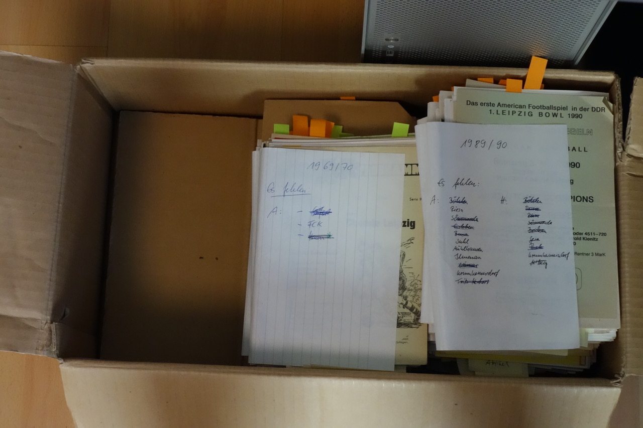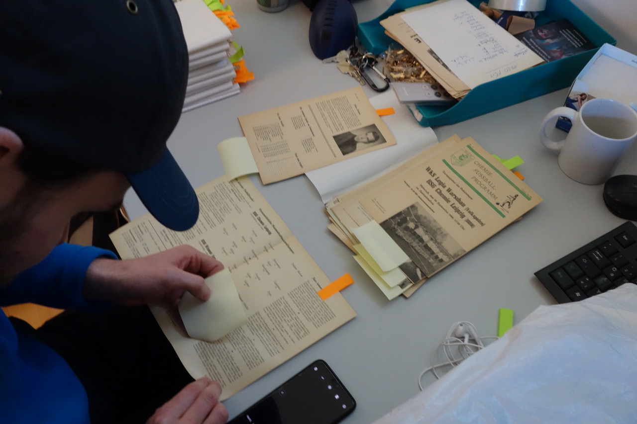 Am Wochenende des 06. bis 08. März nutzten über die Tage verteilt 18 jugendliche Fans die Möglichkeit, sich durch etliche Kisten mit Vereinsdokumenten, Programmheften und Archivmaterial zu wühlen und so der Geschichte der BSG Chemie Leipzig und des Alfred-Kunze-Sportparks auf die Spur zu gehen. Nach einer groben Sichtung wurden unter Anleitung Arbeitsgruppen gebildet, die das Material explizit nach den Themengebieten Bau/Maßnahmen Alfred-Kunze-Sportpark, Fans im offiziellen Erscheinungsbild und Frauen im Verein analysierten und eine erste Einordnung vornahmen. Am letzten Tag wurden die ersten Ergebnisse einander vorgestellt und fließen nun in die Dokumentation über den Alfred-Kunze-Sportpark ein.